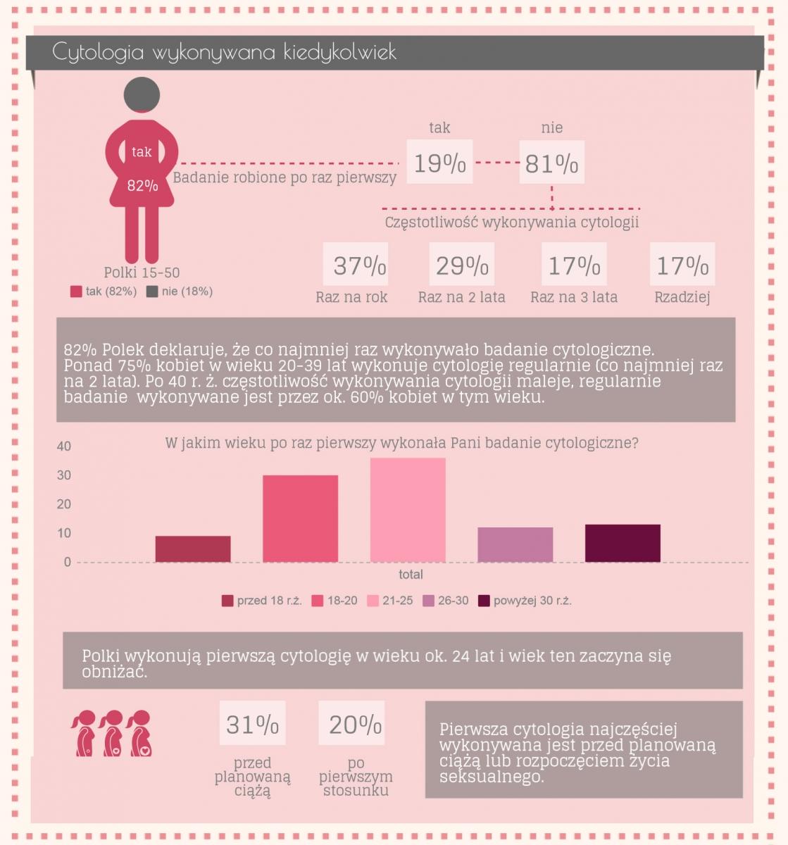 Pierwsza cytologia najczęściej wykonywana jest w wieku ok. 24 lat – zazwyczaj przed planowaną ciążą lub rozpoczęciem życia seksualnego. Pierwsze badanie cytologiczne wykonywane jest najczęściej nieodpłatnie na NFZ. Blisko połowa kobiet (45%), które wykonywały cytologię wielokrotnie deklaruje, że zdarzało się im płacić za to badanie, a co szósta (16%) płaciła za każde wykonane badanie cytologiczne. Udział w Populacyjnym Programie Wczesnego Wykrywania Raka Szyjki Macicy deklaruje co dziesiąta kobieta (9%). Istotnie częściej są to osoby po 40 r. ż. z miast powyżej 200 tys. mieszkańców.Przygotowanie do badania Ponad połowa kobiet nie wie, że do cytologii należy się przygotować i w jaki sposób. Częściej są to osoby przed 30 r.ż i z niższym wykształceniem. Lekarze nie informują pacjentek w jaki sposób mają się przygotować do tego badania. Na brak informacji częściej narzekają nastolatki oraz mieszkanki wsi i małych miast.