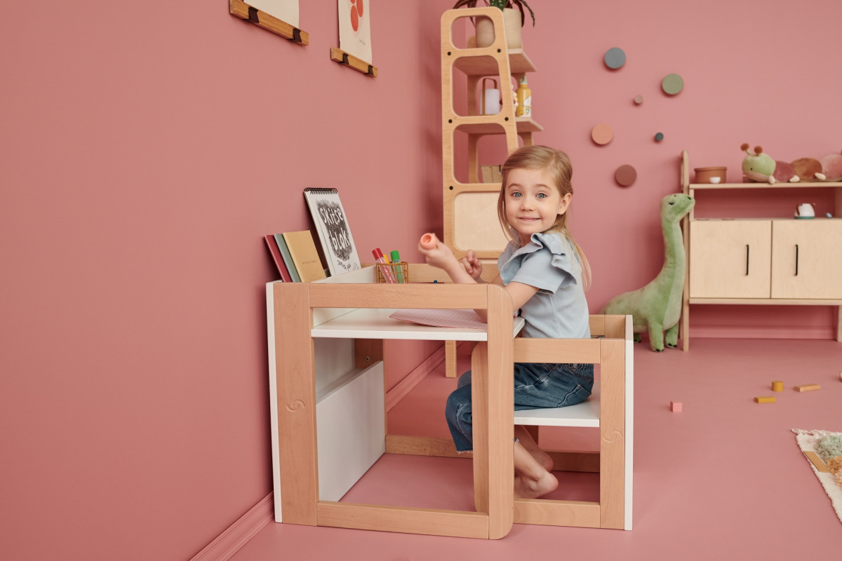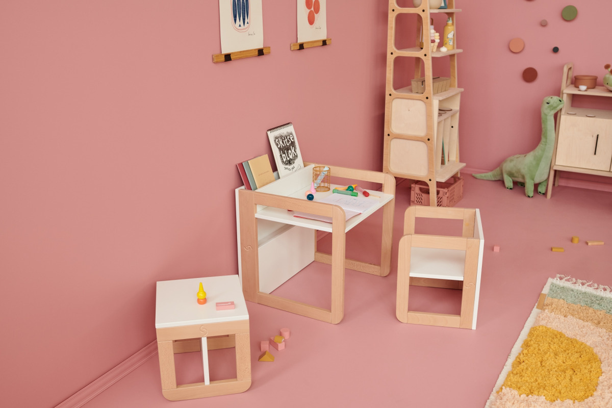 Marka skiddoü zaprojektowała zestaw mebli dla dzieci, gwarantujący dostęp do wielu bodźców pobudzających rozwój kreatywność. Møb to 8 rozwiązań w jednym zestawie, które odpowiadają potrzebom dzieci od 1. do 6. roku życia. To krzesełko dla maluchów w wieku 1-2 lat, które można bez problemu przekształcić w taboret dla starszego dziecka, większe krzesełko, a także stolik z dwoma ustawieniami wysokości blatu i biblioteczką – ten element można też przekształcić w fotel dla starszaka. Już samo komponowanie zestawu dostarcza całej rodzinie mnóstwa radości oraz kreatywnych pomysłów. Klasyczny skandynawski design również dostarcza odpowiednich, stonowanych doznań, które wspierają nieszablonowe myślenie i postępowanie.