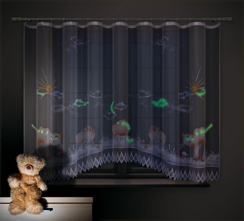 Nie lada gratkę dla dzieci stanowią żakardowe firanki fluorescencyjne. W ciągu dnia ich zabawne wzory cieszą oko i doskonale oddziaływają na wyobraźnię maluszków. Największe wrażenie robią jednak w nocy. Wówczas, po zgaszeniu światła, zaczynają świecić, tworząc tym samym niezwykły, pełen magii klimat. – Oferujemy modele ze zwierzętami, między innymi, ze świecącymi kotkami oraz sowami. Uniwersalność wzorów powoduje, że świetnie komponują się w pokojach chłopca i dziewczynki – wyjaśnia Magdalena Tomaszewska.