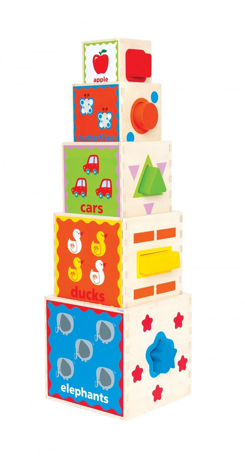 Edukacyjna piramida dla bardziej dociekliwych maluszków, składa się z pięciu drewnianych pudełek, które