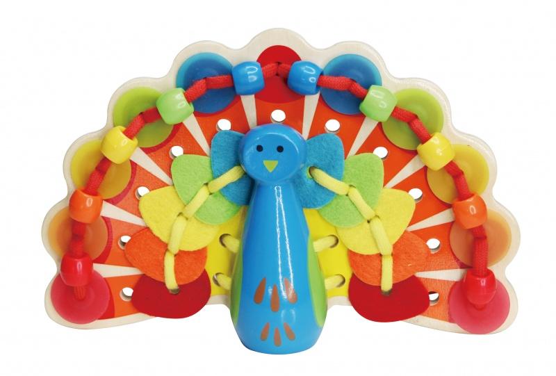 Sznurowany paw powinien znaleźć się pod choinką wszystkich dzieciaków, które uwielbiają przyrodę i otaczający ich świat. Zabawka zawiera drewnianą podstawę z tułowiem i główką pawia, do której można przymocować za pomocą sznureczka kolorowe koraliki, krążki i elementy wykonane z filcu. Dzięki dowolności ozdabiania pawia, dziecko rozwija swoją wyobraźnię i kreatywność, a przeplatanie elementów i łączenie ich za pomocą sznurka kształtuje zdolności manualne pociechy. Przyjazna kolorystyka zachęca do